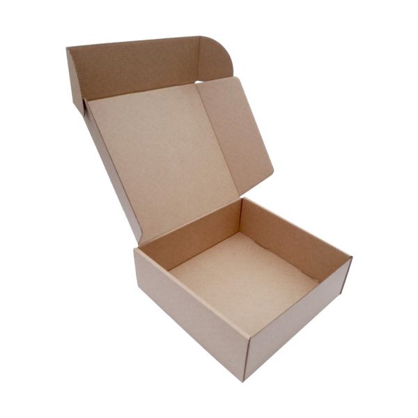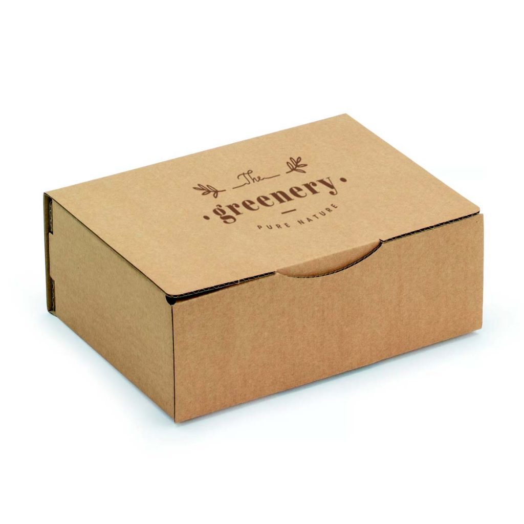 Caixa com fundo automático e fecho adesivo, fabricada em cartão canelado fino reciclável e folha exterior em papel kraft.